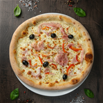 Witte saus, Fior di Latte Mozzarella, Ham, Paprika, Grana Padano, Olijven