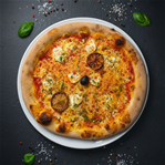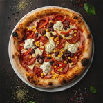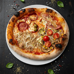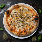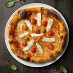 San Marzano tomaten, Fior di Latte Mozzarella, Paprika, Champignons, Mais, Ui, Kerstomaten, Courgette