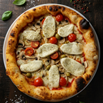 Witte saus(Zure room, Knoflook, Olijfolie, Peper en Zout), Fior di Latte Mozzarella, Kerstomaten, Mozzarella Cucina