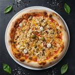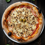 San Marzanno tomaten, Fior di Latte Mozzarella, Kip, Gorgonzola, Paprika, Grana Padano, Olijven
