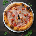 San Marzano tomaten, Fior di Latte Mozzarella, Ham, Champignons