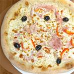 Witte saus, Fior di Latte Mozzarella, Ham, Paprika, Grana Padano, Olijven